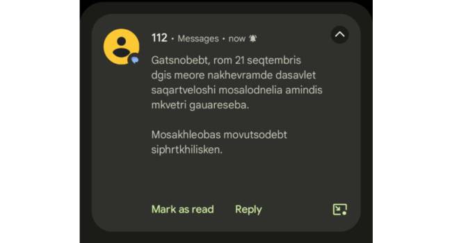 მოსახლეობას მოვუწოდებთ სიფრთხილისკენ”,_ წერია სმს შეტყობინებაში, რომელსაც 112 მობილურ ნომრებზე აგზავნის.