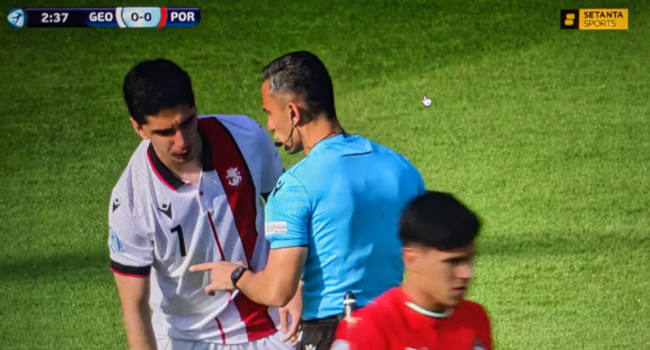 მატჩის პირველივე წუთებში მსაჯმა ჩვენი ნაკრების თავდამსხმელს, ლაშა ოდიშარიას წითელი ბარათი უჩვენა და თამაშიდან გააძევა.