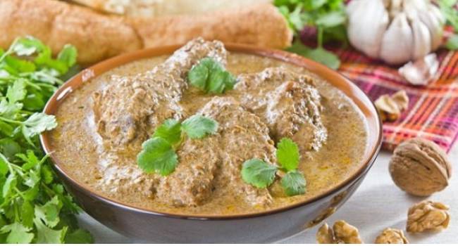 ინდაურის ხორცი ზომიერ ნაჭრებად დავჭრათ, გავრეცხოთ, ნელ ცეცხლზე შემოვდგათ და ცოტა ხანს ვხარშოთ (ბოლომდე არ უნდა მოიხარშოს), შემდეგ ნახარში გადმოვწუროთ და ხორცს წვრილად დაჭრილი ხახვი და დაფნის ფოთლები დავუმატოთ. მოვხრაკოთ ისე, რომ ხახვი არ გაშავდეს. ცალკე დავნაყოთ ან გავატაროთ ნიგოზი, ნიორი, წიწაკა, შავი წიწაკა, ხმელი ზაფრანი, ხმელი ქინძე, ნედლი ქინძი, მიხაკ-დარიჩინი, მარილი გემოვნებით, ხორცის ნახარში დავასხათ და ავურიოთ. მიღებული მასა მოხრაკულ ინდაურის ხორცს დავასხათ და ცოტა ხნით ვადუღოთ. იმისთივს, რომ არ გაშავდეს, დავუმატოთ თეთრი ძმარი გემოვნებით.