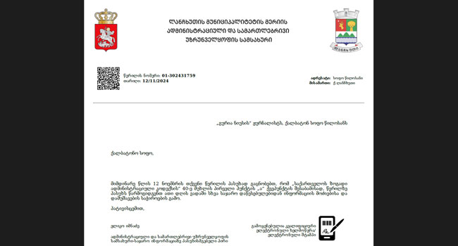 საჯარო ინფორმაციის გამოთხოვიდან მეორე დღეს, 12 ნოემბერს, ლანჩხუთის მერიიდან, კერძოდ კი მუნიციპალიტეტი მერიის ადმინისტრაციული და სამართლებრივი უზრუნველყოფის სამსახურიდან წერილი მივიღეთ, რომელშიც ნათქვამია: “მიმდინარე წლის 12 ნოემბრის თქვენი წერილის პასუხად გაცნობებთ, რომ “საქართველოს ზოგადი ადმინისტრაციული კოდექსის 40-ე მუხლის პირველი პუნქტის “ა” ქვეპუნქტის შესაბამისად, წერილზე პასუხს წარმოგიდგენთ 10 დღის ვადაში სხვა საჯარო დაწესებულებიდან ინფორმაციის მოძიების და დამუშავების საჭიროებების გამო“.