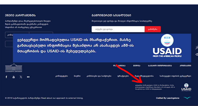 “ვებგვერდი მომზადებულია USAID-ის მხარდაჭერით. მასზე განთავსებული ინფორმაცია შესაძლოა არ ასახავდეს აშშ-ის მთავრობის და USAID-ის შეხედულებებს”, _ წერია parluament.ge-ს Footer-ში ანუ ქვედა ნაწილში.