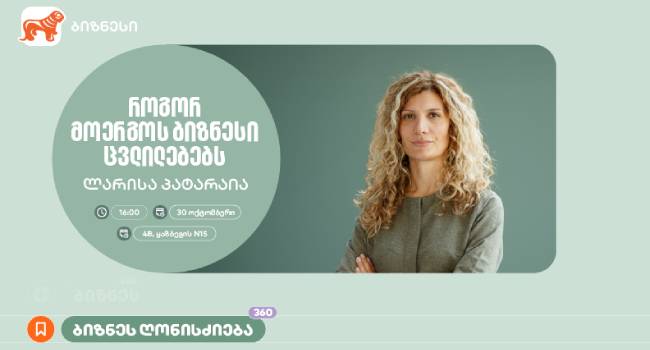 საქართველოს ბანკი ბიზნესის მხარდამჭერი ინიციატივების განხორციელებას განაგრძობს. “ბიზნეს 360˚“ პლატფორმის შეხვედრების სერიის ფარგლებში, 30 ოქტომბერს ლარისა პატარაიას ვორკშოპი — „როგორ უნდა მოერგოს ბიზნესი ცვლილებებს: კრიზისიდან სტრატეგიამდე“ გაიმართება.