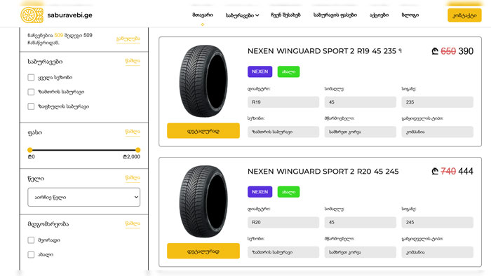 საბურავების სრული კატალოგი ერთ სივრცეშიSaburavebi.ge-ზე წარმოდგენილია საბურავების ვრცელი კატალოგი, სადაც მომხმარებელს შეუძლია მოიძიოს ნებისმიერი ტიპის საბურავი – იქნება ეს ზამთრის საბურავები, ზაფხულის საბურავები თუ ყველა სეზონისთვის განკუთვნილი მოდელები. პლატფორმა განსაკუთრებით მოსახერხებელია იმ მძღოლებისთვის, რომლებიც სეზონის ცვლილებასთან ერთად საბურავების შეცვლაზე ზრუნავენ. აქვე წარმოდგენილია მეორადი საბურავების ფართო არჩევანი იმ მომხმარებლებისთვის, ვისაც ეკონომიური ვარიანტების შეძენა სურს. ყველა შემოთავაზება თავმოყრილია მარტივ და მოსახერხებელ ინტერფეისში, რაც მნიშვნელოვნად ამცირებს ძიების დროს. მარტივი ნავიგაცია და ძიების ეფექტური სისტემაSaburavebi.ge გამოირჩევა ინტუიციური და მოსახერხებელი ნავიგაციით. პლატფორმაზე მომხმარებელს შეუძლია საბურავები მოიძიოს სხვადასხვა პარამეტრის მიხედვით: