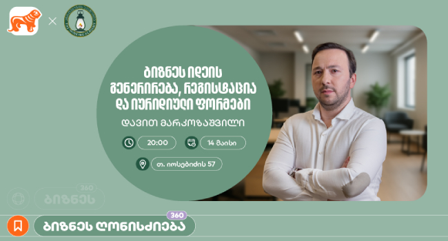 ლექცია განკუთვნილია ყველასთვის, ვისაც საკუთარი ბიზნესის დაწყების გზაზე პირველი ნაბიჯების გადადგმა სურს. შეხვედრის მონაწილეებს წარმოდგენა შეექმნებათ იმ ეტაპებზე, რომლებიც იდეის ბიზნესად გარდაქმნას უძღვის წინ — მათ შორის, იდეის გენერირებას, მის შეფასებას, სტრუქტურირებასა თუ პრაქტიკაში განხორციელებას.