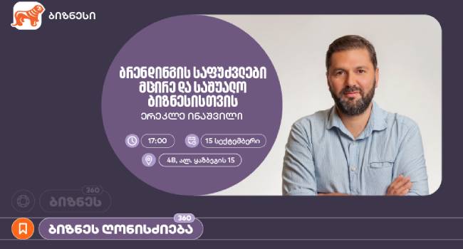 საქართველოს ბანკი განაგრძობს მცირე და საშუალო ბიზნესის მხარდაჭერას და მათთვის საგანმანათლებლო შესაძლებლობების შექმნას. ამ მიზნით, პლატფორმა ბიზნეს 360-ის ფარგლებში, ბრენდის დიზაინერის, ერეკლე ინაშვილის ვორკშოპი გაიმართება. ვორკშოპი „ბრენდინგის საფუძვლები მცირე და საშუალო ბიზნესისთვის“ 15 სექტემბერს, 15:00 საათზე გაიმართება. იგი 4 სთ-იან პრაქტიკულ სამუშაო სესიას წარმოადგენს და მცირე და საშუალო ბიზნესის წარმომადგენლებს ბრენდინგის პროცესების შესახებ ინდივიდუალური ხედვების ჩამოყალიბებაში დაეხმარება.