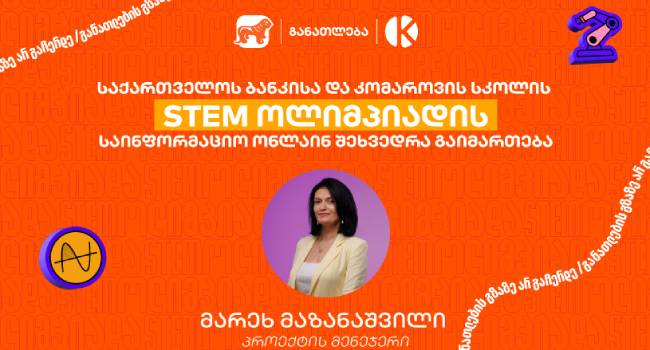 ინფორმაციისთვის საქართველოს ბანკისა და კომაროვის სკოლის STEM ოლიმპიადაზე რეგისტრაცია 30 ნოემბრის ჩათვლით გრძელდება. დარეგისტრირდი და გამოავლინე შენი ცოდნა ფიზიკისა და მათემატიკის მიმართულებით და გაიმარჯვე.
