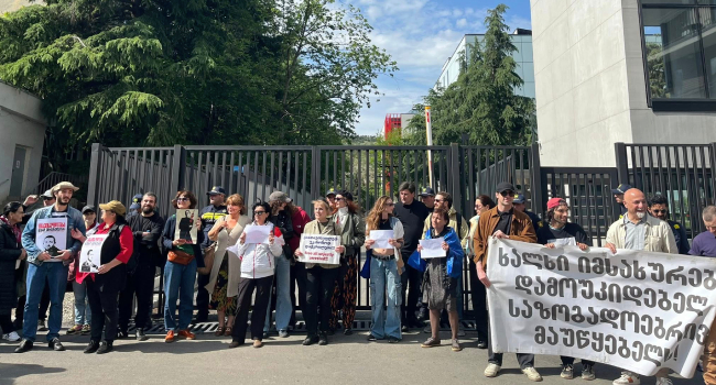 „გაშუქდეს სასამართლო პროცესები!“, „ეთერი რეჟიმის ტყვეების ოჯახის წევრებს!“ – საზოგადოებრივი მაუწყებლის ახალ შენობასთან აქცია იმართება.