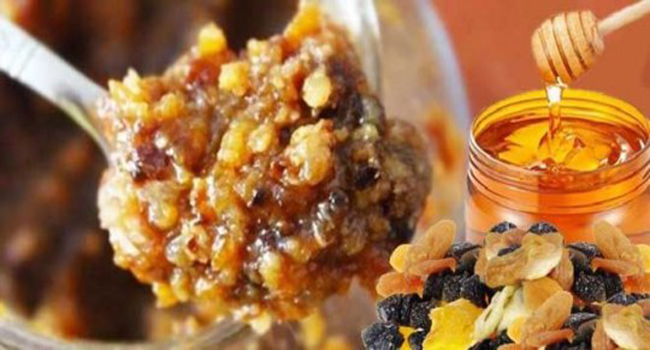 - 2. გაატარეთ ხორცის საკეპ მანქანაში ყველა ინგრედიენტი, ლიმონის და თაფლის გარდა. გამოწურეთ ლიმონის წვენი და დაამატეთ გატარებულ ჩირს და ნიგოზს. დაამატეთ თაფლი, კოვზით კარგად შეურიეთ ერთმანეთს და დააბლენდერეთ.