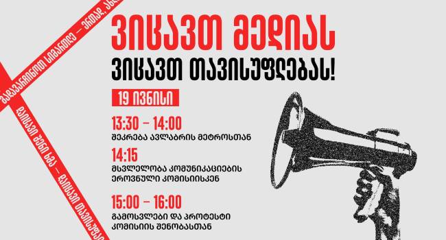 “ვიცავთ მედიას- ვიცავთ თავისუფლებას!”- ამ ლოზუნგით 19 ივნისს თბილისში აქცია გაიმართება. ინფორმაცია სოციალურ ქსელში ვრცელდება: